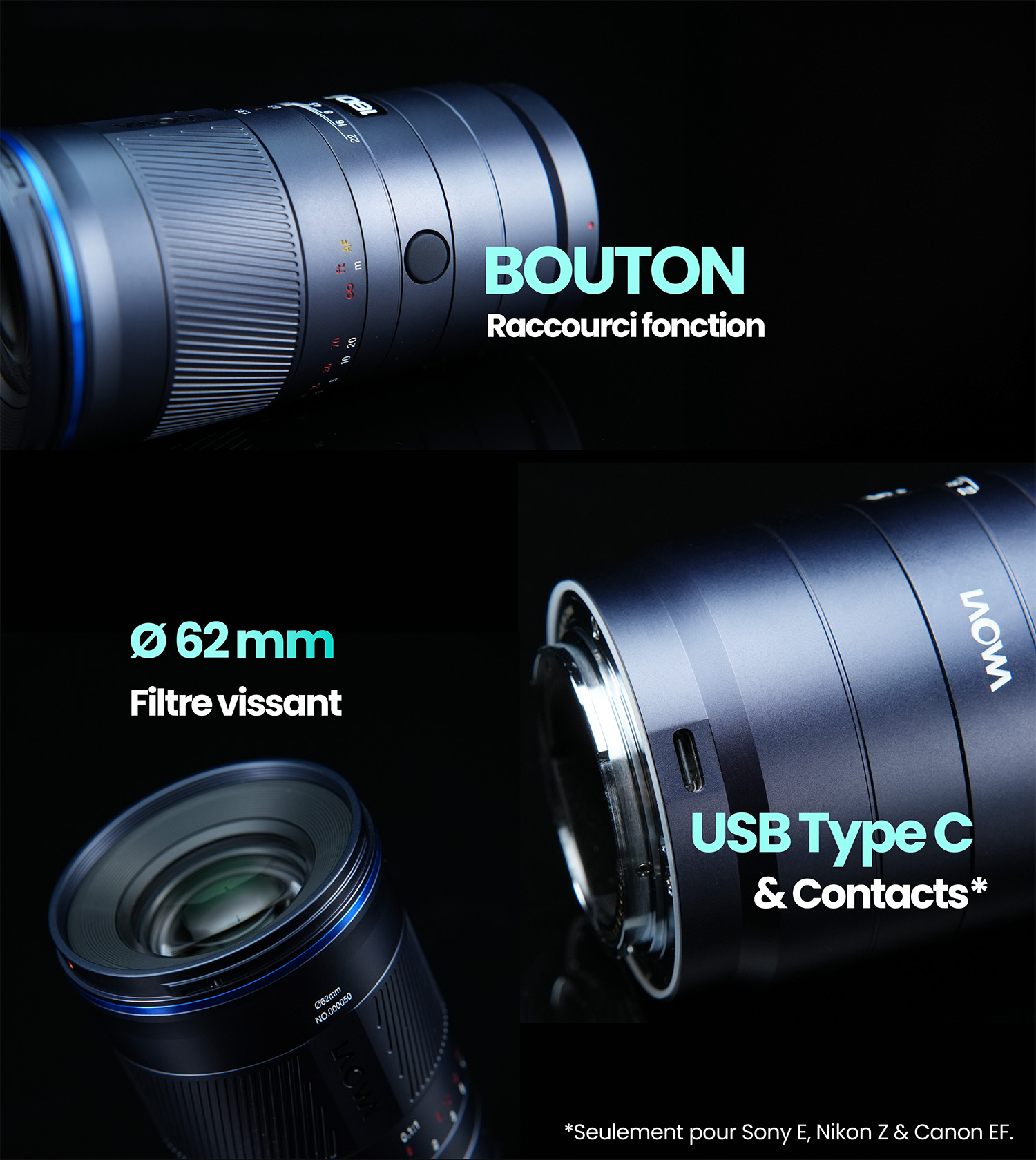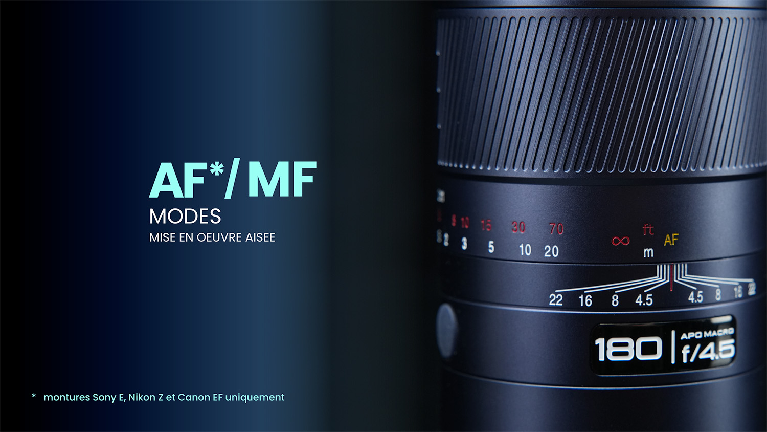 Montures disponibles: Sony E, Nikon Z et Canon EF avec Autofocus - Canon RF et L mount uniquement MF.