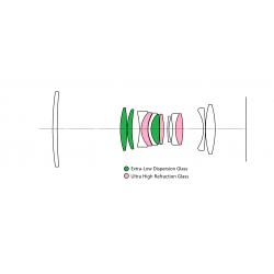 L'objectif est conçu avec 3 verres à très faible dispersion, supprimant l'aberration chromatique longitudinale et latérale dans les zones nettes et floues. Les franges violettes et les images fantômes sont réduites au minimum sur toute la plage d'ouverture. La caractéristique APO réduit considérablement le temps de post-édition, en particulier en macrophotographie.
